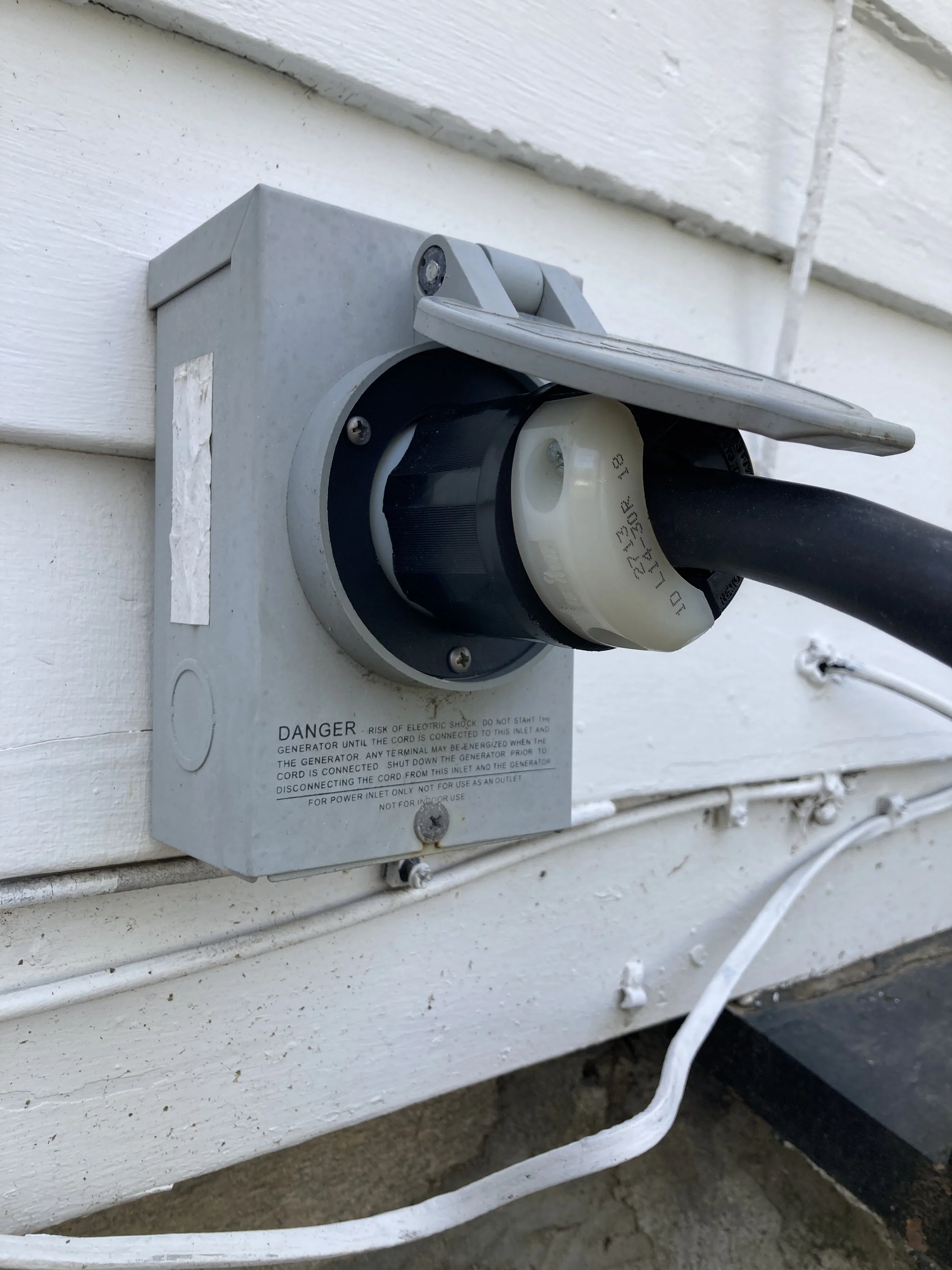 A portable generator gets plugged into an outdoor power inlet box, and supplies electricity to the home's main electrical panel through a transfer switch.